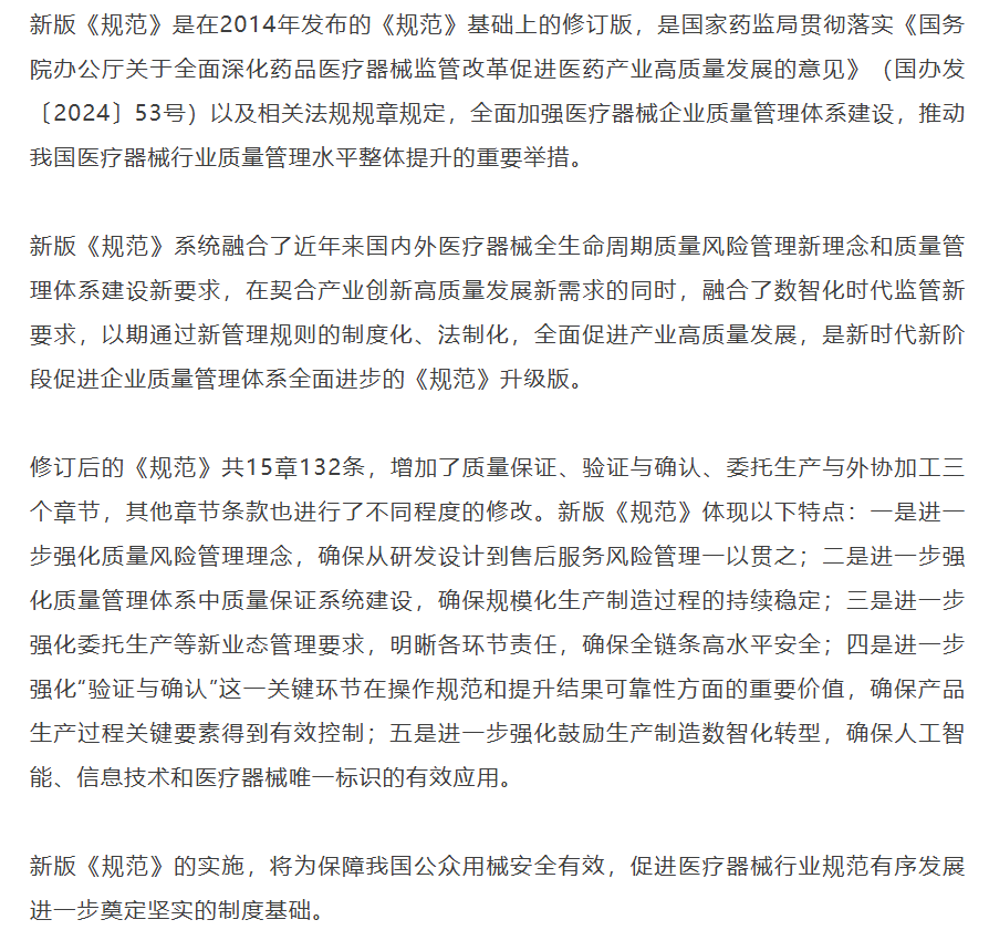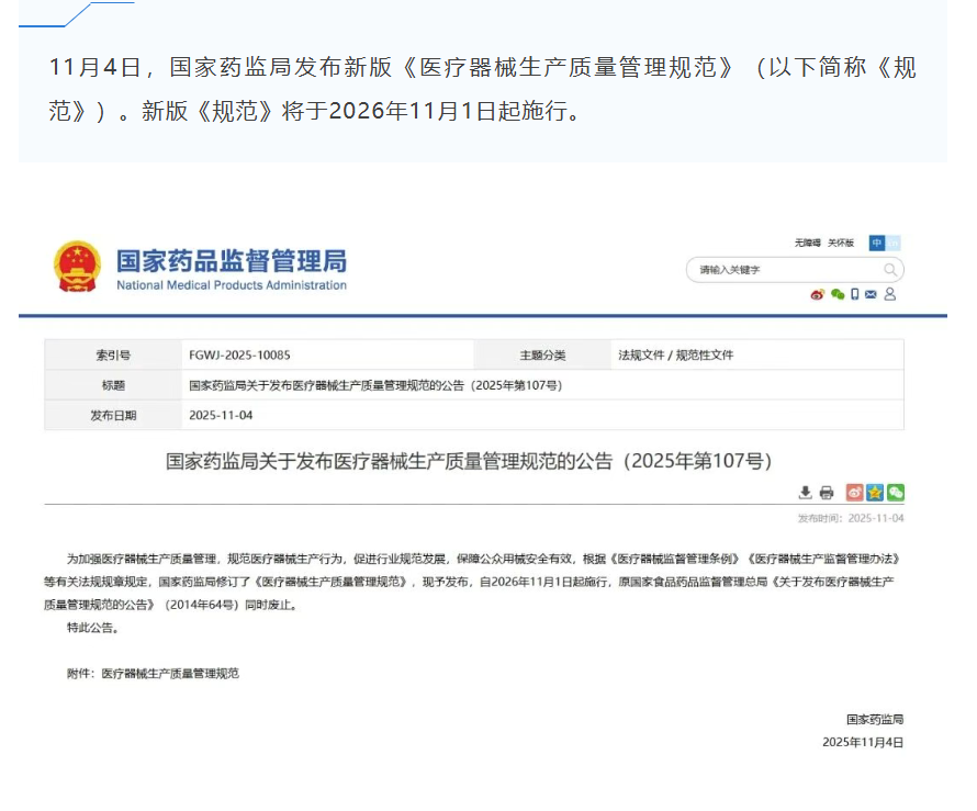 《醫療器械生產質量管理規范》修訂發布 2026年11月1日起施行